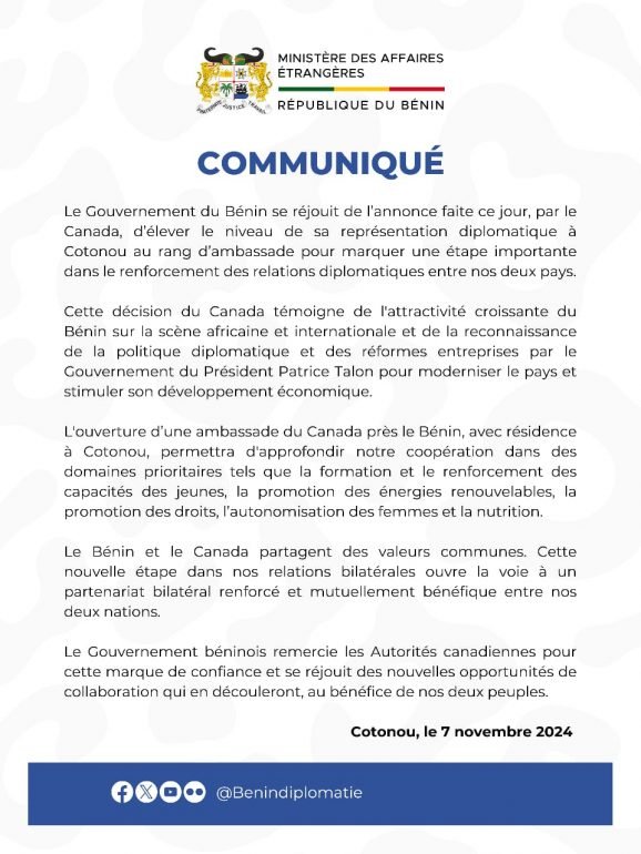 Le ministère des affaires étrangères annonce l’ouverture prochaine de l’ambassade du Canada au Benin avec résidence à Cotonou.
